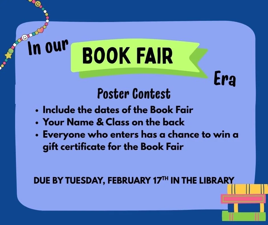 Book Fair Student Poster Contest - February 6 -February 17: Students are invited to enter the Student Poster Contest for a chance to win a gift certificate to use at the Book Fair! Please see below for entry rules.